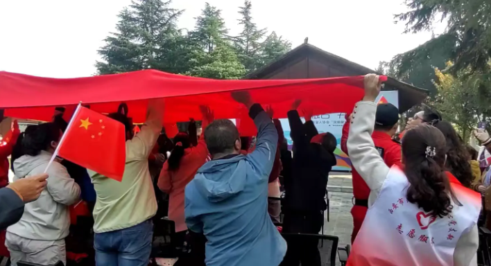 当五星红旗跃过人们的头顶,大家都激动的抚摸着五星红旗。