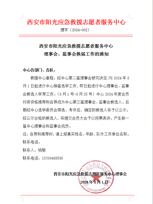 西安市阳光应急救援志愿者服务中心 理事会、监事会换届工作的通知