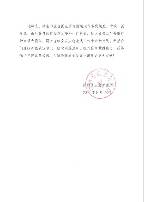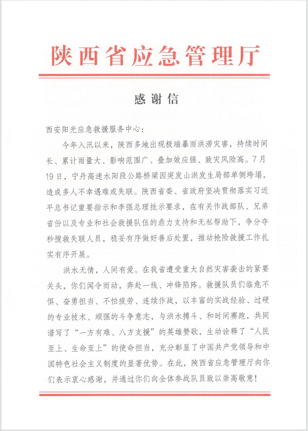 陕西省应急管理厅对阳光应急救援服务中心的感谢信